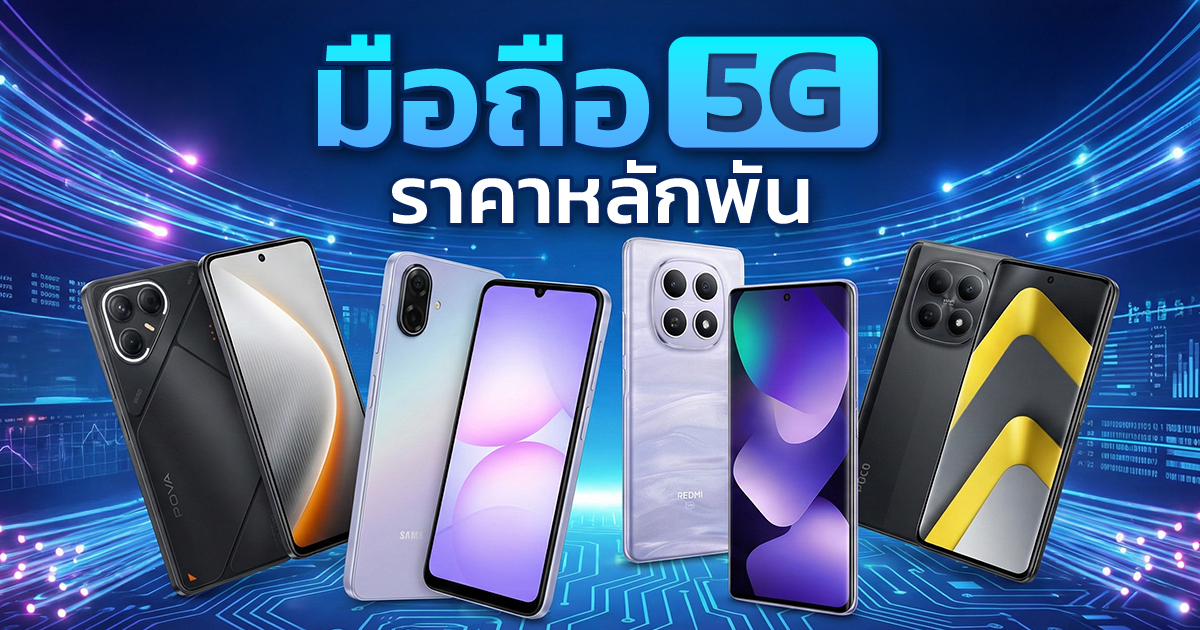 แนะนำโทรศัพท์มือถือ 5G ราคาไม่เกิน 5,000-10,000 บาท ปี 2026 รวมรุ่นใหม่น่าสนใจ สำหรับผู้ที่มีงบแค่หลักพัน อยากได้มือถือราคาถูก ในสเปกระดับกลาง ปัจจุบันโทรศัพท์มือถือที่รองรับ 5G รุ่นใหม่ ๆ เริ่มมีราคาที่จับต้องมากขึ้นเมื่อเทียบกับเมื่อหลายปีก่อน ทำให้คนที่มีงบแค่ไม่กี่พันก็สามารถเป็นเจ้าของมือถือ 5G ได้ไม่ยาก โดยในวันนี้เราได้รวบรวมมือถือ 5G ราคาไม่เกิน 5,000-10,000 บาทที่มีจำหน่ายในช่วงปี 2026 มาแนะนำให้แล้ว จะมีรุ่นไหนน่าสนใจบ้าง ขอชวนเพื่อน ๆ ตามไปดูกันเลย ! และทั้งหมดนี้ก็คือโทรศัพท์มือถือ 5G รุ่นใหม่ ๆ ที่เราได้รวบรวมมาแนะนำสำหรับผู้ที่มีงบหลักพัน หากใครกำลังอยากได้มือถือรุ่นที่รองรับ 5G ในราคาประหยัดมาใช้สักเครื่อง ก็ลองนำเอาไปพิจารณาเลือกซื้อกันได้เลย แต่อย่าลืมตรวจสอบราคากันอีกครั้งด้วยนะ เพราะราคาอาจมีการเปลี่ยนแปลงไปจากที่ได้ระบุไว้ ขึ้นอยู่กับการปรับราคาและโปรโมชั่นในช่วงต่าง ๆ ของแต่ละร้านตัวแทนจำหน่ายครับ โทรศัพท์ vivo ล่าสุด ปี 2026 ล่าสุดราคาเท่าไร มีรุ่นไหนบ้าง ? ราคาโทรศัพท์ Samsung ทุกรุ่นล่าสุด ปี 2026 เท่าไหร่บ้าง เช็กเลย ! Samsung Galaxy A07 5G เปิดตัวมือถือราคาประหยัด แบตฯ ใหญ่ใช้ได้นาน Redmi Note 15 Series เปิดตัวราคาไทย มือถือระดับกลางพร้อมหน้าจอกันตกกระแทก เปิดตัวราคาไทย OPPO Reno15 Series มือถือใหม่พร้อมกล้องเซลฟี่มุมกว้าง ขอบคุณข้อมูลและภาพจาก : samsung.com, mi.com, tecno-mobile.com, oppo.com, vivo.com, realme.com, infinixmobility.com