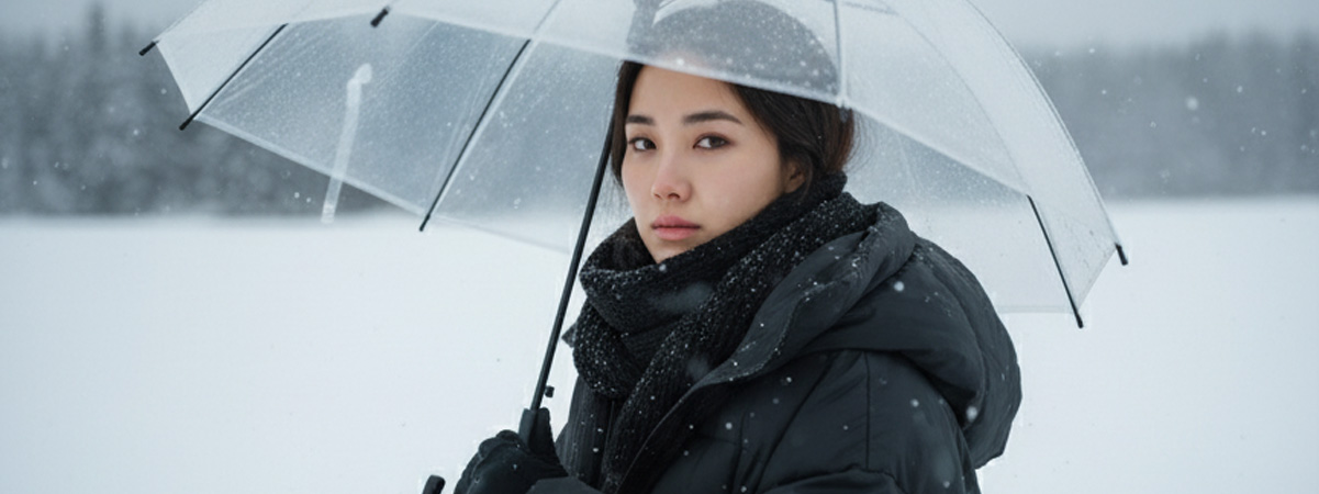 ภาพที่ 1 (ภาพบุคคล): ตัวละครถือร่มโปร่งใส หันหน้าไปด้านหลังเล็กน้อยขณะมองตรง สีหน้าเศร้าโศก ดวงตาเต็มไปด้วยความรู้สึก พื้นหลังเบลอเป็นหิมะสีขาว